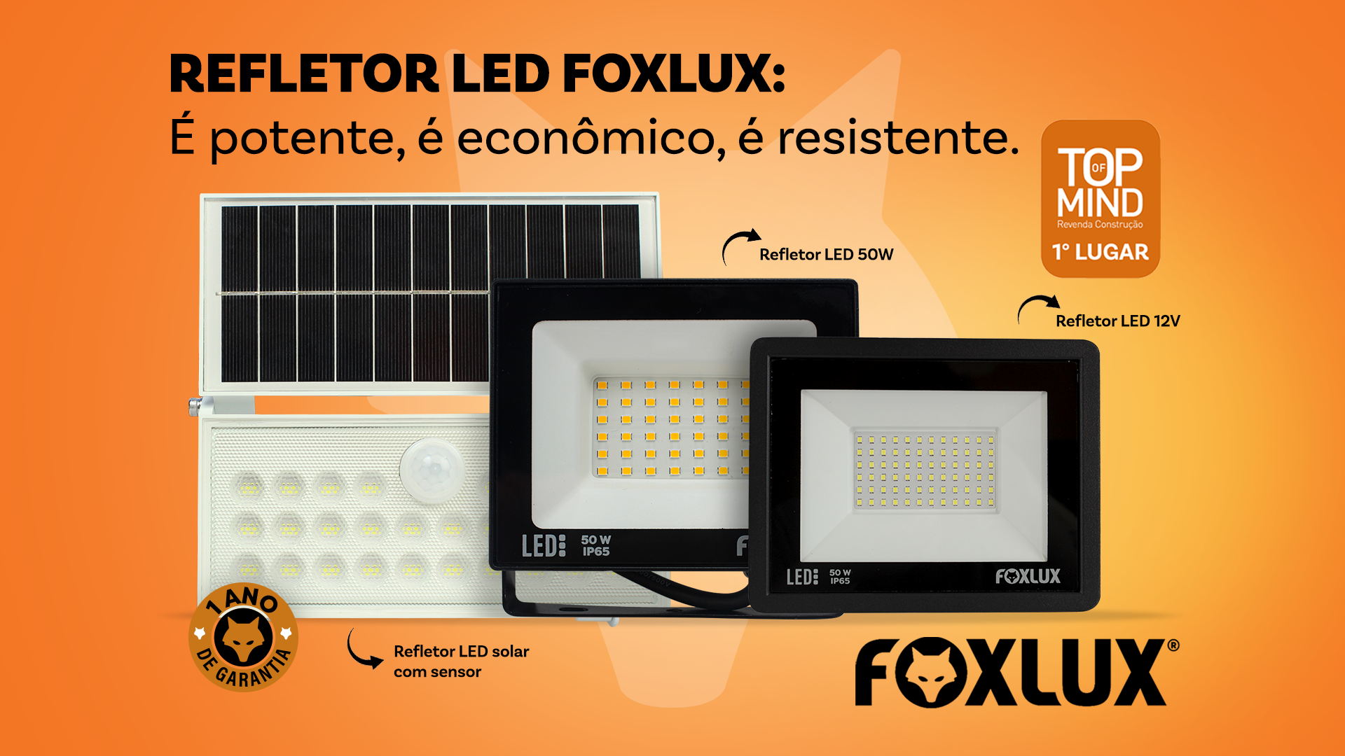Com economia de 80% de energia, 30.000 horas de vida útil, proteção IP65 e o reconhecimento como produto Top of Mind 2025, o Refletor LED Foxlux é a escolha inteligente para quem busca iluminação profissional de qualidade superior.